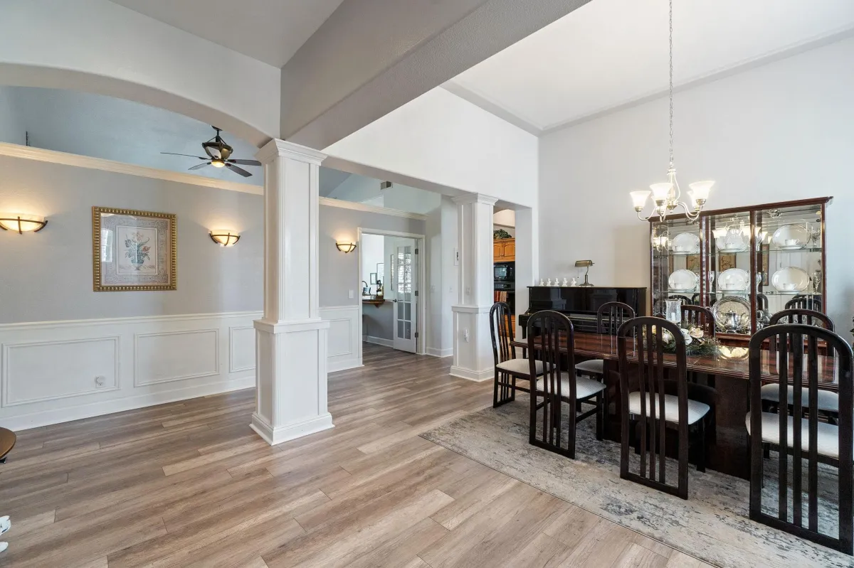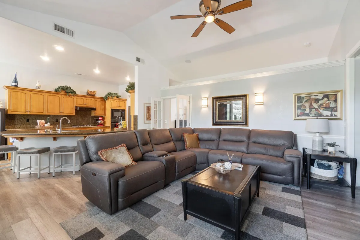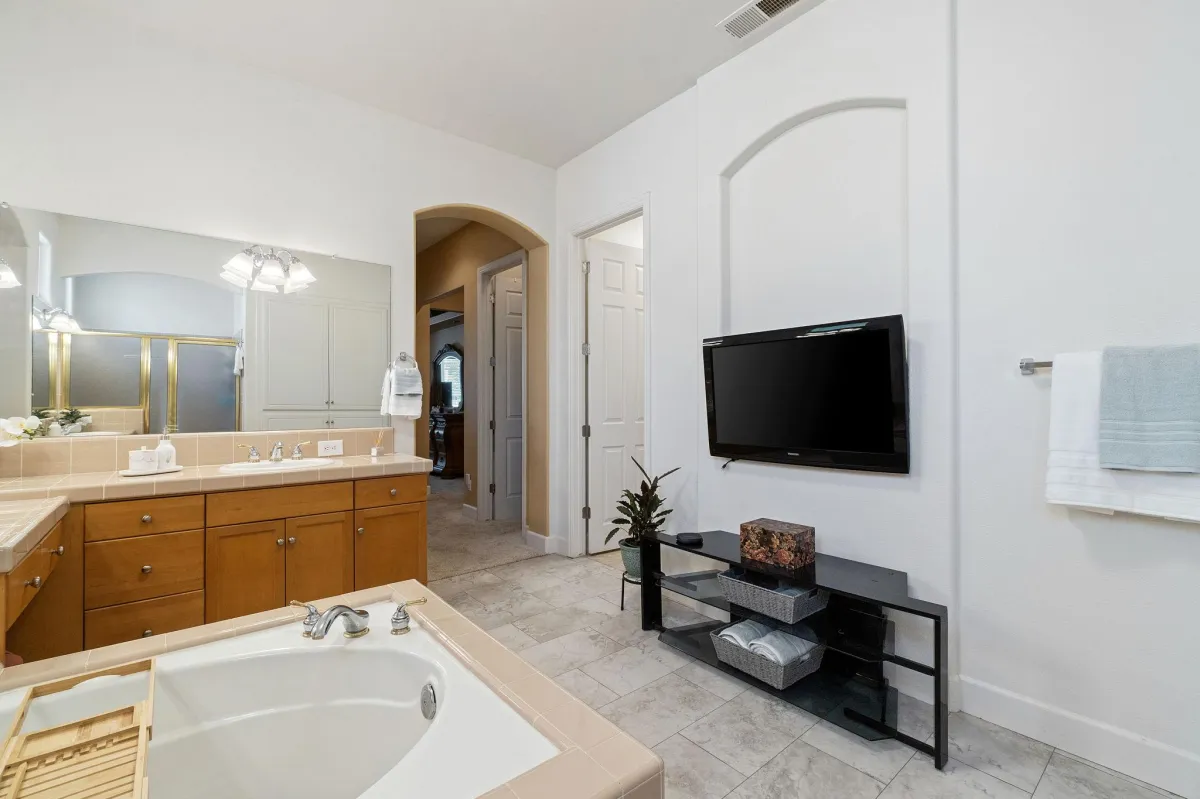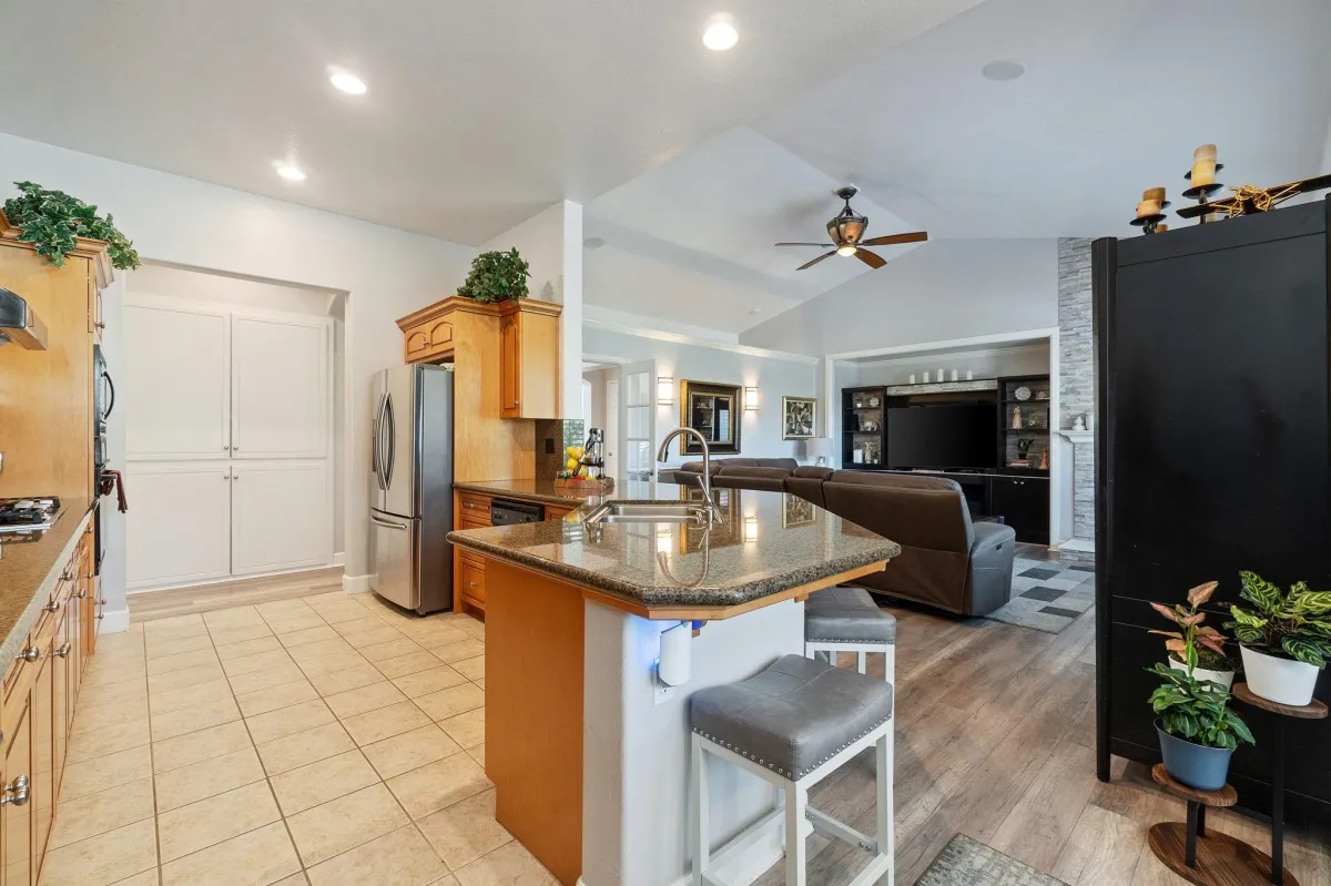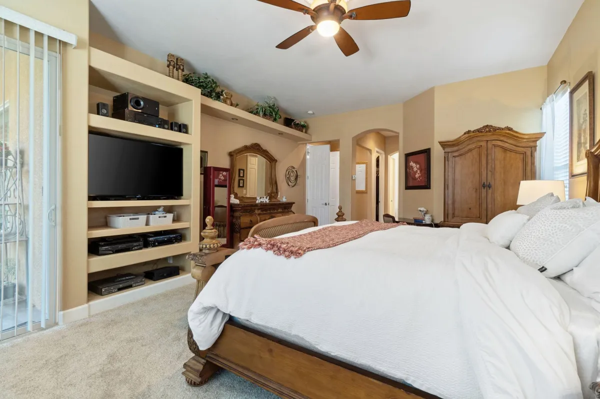 This home has been well loved, updated, and well maintained by its original owners since new! Attention to detail displayed throughout from the ornate tile inlay at the entry, to the custom wood trim paneling, and custom shutters. Fresh premium carpet installed in primary bedroom as well as front bedroom, and updated LVP flooring throughout ready for new owners to enjoy. Beautiful kitchen cabinets hide custom inserts to make life in the kitchen a breeze, the pantry also has custom slide outs to utilize as much space as conveniently as possible. Extended kitchen countertop doubles as a breakfast bar while allowing the kitchen to seamlessly flow into the living room and informal dining area. Living room boast high and vaulted ceilings, surround sound, and a beautiful stoned in fireplace with mantel. Formal living room allows greater flexibility for hosting and around the holidays. The primary bedroom has a grand feel while being secluded from other bedrooms and show stopping features such as dual walk-in closets, dual vanities, extra storage and space to spare! Second bedroom is isolated and is not far from designated bathroom. While the 3rd and 4th bathroom are also secluded and adjoined with a private Jack and Jill bathroom! Backyard features a large covered patio with outdoor fan, spa with deck, mature vegetation, a few fruit trees, as well as storage sheds.